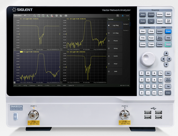 除開外觀設(shè)計(jì),其先進(jìn)的用戶界面,配合上12.1英寸超大觸摸屏與外接的鼠標(biāo)和鍵盤,讓工程師能更快的添加或刪除窗口,通道和跡線。SNA5000A支持在多個(gè)窗口下,添加多條跡線進(jìn)行S參數(shù)測量。并且測量結(jié)果,可以多種數(shù)據(jù)格式顯示,如 Log Mag,Lin Mag,Phase,Delay,Smith,SWR,Polar等,可以方便快捷地分析被測物的傳輸系數(shù),反射系數(shù),駐波比,阻抗匹配,相位,延時(shí)等參數(shù)。