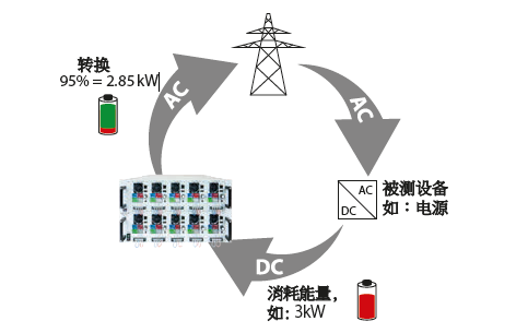 本負載最主要的特點是其AC輸入端,即電網連接端,它也可用作直流電返回的輸出端,轉換效率接近93%。這種能量轉換方式有助于降低用電成本,且避免使用昂貴的制冷系統,因為普通電子負載使用過程中會將直流輸入電量轉化成熱量,從而需要制冷系統進行冷卻。