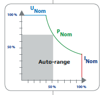 本系列所有型號的輸出功率都可靈活調整。可在較低電流時輸出較高電壓,或在低電壓時輸出較高電流,但總是維持在最大額定功率范圍內。因此僅用一臺產品就能覆蓋廣泛的應用。