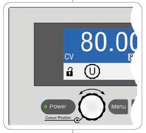 通過該顯示器,電壓與電流的實際輸出值和預設值,(CV, CC, CP) 實際控制狀態與其它狀態,報警與設置菜單的設定,都清晰顯示出來。